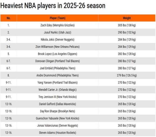 北京时间10月12日,距离新赛季NBA常规赛开战还有10天的时间。在今天早些时候,欧洲媒体BasketNews列出了当今NBA联盟球员体重榜单,其中杨瀚森并列第九,扎克-埃迪排名第一位,约基奇和锡安并列第三。