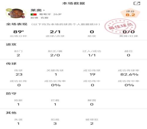 雷速体育10月20日宣 在今天进行的AC米兰2-1佛罗伦萨的意甲联赛中,莱奥梅开二度帮助米兰逆转取胜登顶意甲榜首,个人当选全场最佳球员。