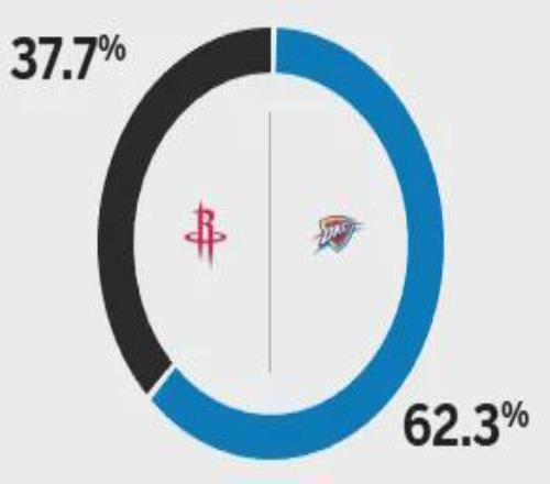 今日,ESPN对本场比赛进行了预测:卫冕冠军雷霆本场比赛胜率超六成,火箭胜率仅37.7%。