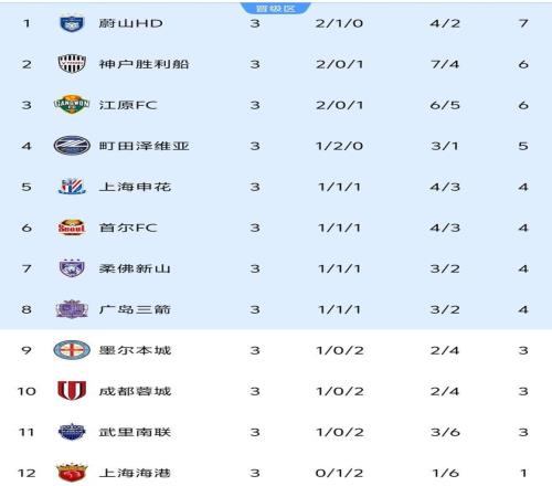 榜首方面,由于神户胜利船本轮失利,蔚山HD以7分领跑,神户胜利船、江原FC同积6分分列第2和第3。3轮过后,前8的球队仅有3分之差,与申花同积4分的球队更是多达3支,分差方面差距不大。