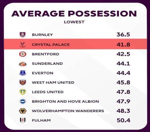 本赛季英超已经进行了10轮比赛,根据英超官方的统计数据,水晶宫是本赛季至今平均控球率第二低的球队,但他们的预期进球数最高。