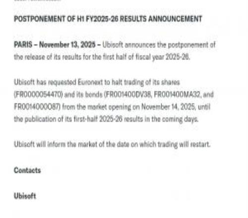 体育资讯11月14日称 据外媒报道,育碧今日突然发布公告,宣布推迟最新财报的公布,并且暂停了股票和债券的交易。具体公布财报时间和恢复交易时间待定。