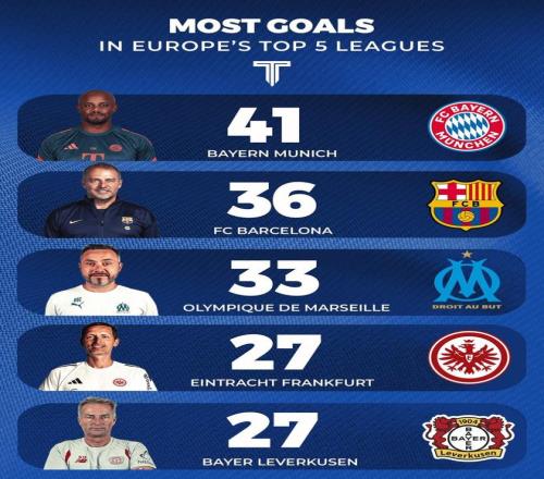 北京时间11月24日,The Touchline统计出了本赛季至今欧洲五大联赛进球最多的五支球队,三支德甲球队入围,11轮德甲狂轰41球的拜仁慕尼黑领跑,巴塞罗那13轮西甲打进36球排名第二。