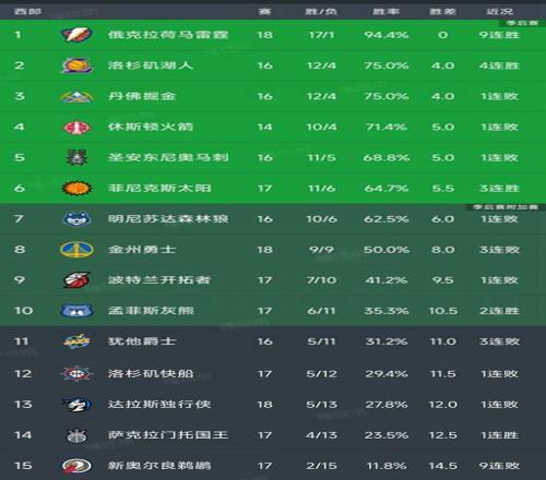 NBA西部最新积分榜:雷霆9连胜,湖人升第2,太阳第6,快船第12