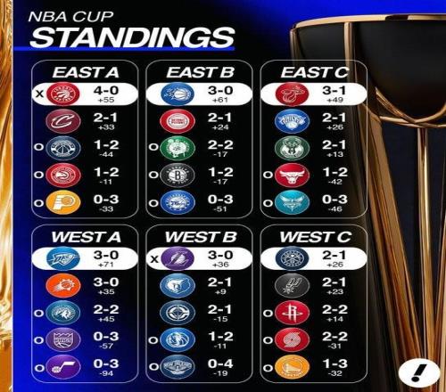 东部方面,猛龙队在A组四战全胜头名出线,骑士则需要在完成最后一轮比赛后争夺东部最好的小组第二外卡名额。B组中,尽管魔术3战全胜,但末轮他们将面对小组第二活塞队,若失利将失去头名需要对比外卡积分。C组中,热火队四战结束3胜1负,需要看末轮雄鹿和尼克斯的直接较量,若尼克斯取胜,他们将落到第二名,若雄鹿取胜他们将出线。
