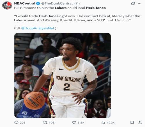 北京时间12月11日,NBA名嘴比尔-西蒙斯在节目中透露:洛杉矶湖人队有希望交易得到赫伯特-琼斯,他们现在只需要一个电话,愿意送出克勒贝尔、克内克特、1个首轮签都可以得到赫伯特-琼斯。