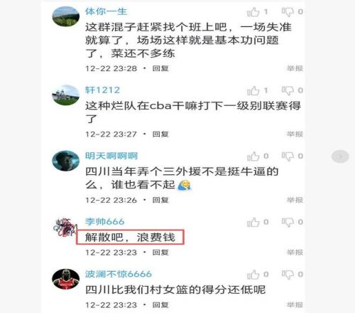不过四川队摆烂是有原因的,那就是他们近两年资金链紧张、频频欠薪,俱乐部投资人因为债台高筑身陷囹圄,俱乐部内忧外患,球员士气低迷,最终在主场遭遇了一场载入史册的惨败。球迷也是为四川队感到叹息,“唉,没钱就啥也不行了”、“这样的球队留在CBA没有意义”、“解散吧,浪费钱”了。不知四川队还能挺多久?不解散也得尽快出卖了吧。你们说呢?