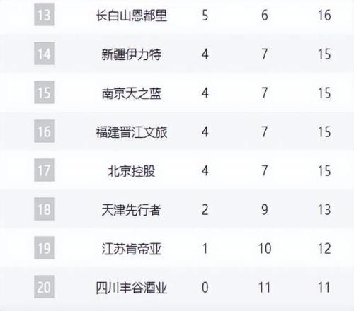 新疆、同曦、福建、北控组成混战集团。新疆队进攻体系渐入佳境,同曦队郭昊文独木难支,福建队单靠外援的爆发难掩整体颓势,北控队张帆的伤病阴影笼罩全队。而天津、江苏、四川三支球队已基本锁定倒数3名,但天津队战胜北控的这场胜利,或许能成为赛季转折点。
