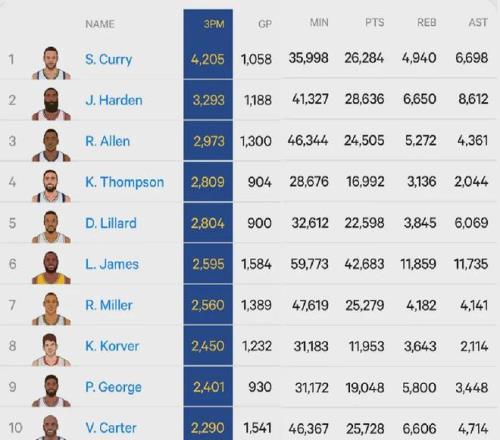 汤普森(2809)正式超越利拉德(2804),升至NBA史上三分球命中数榜单第4位。